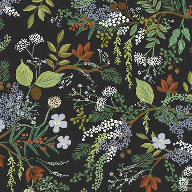 Lush and verdant, Willowberry features vines of greenery that are dotted with metallic berries. The colorways are all nature-inspired hues, ranging from a subtle neutral to soft greens to a deep blue.