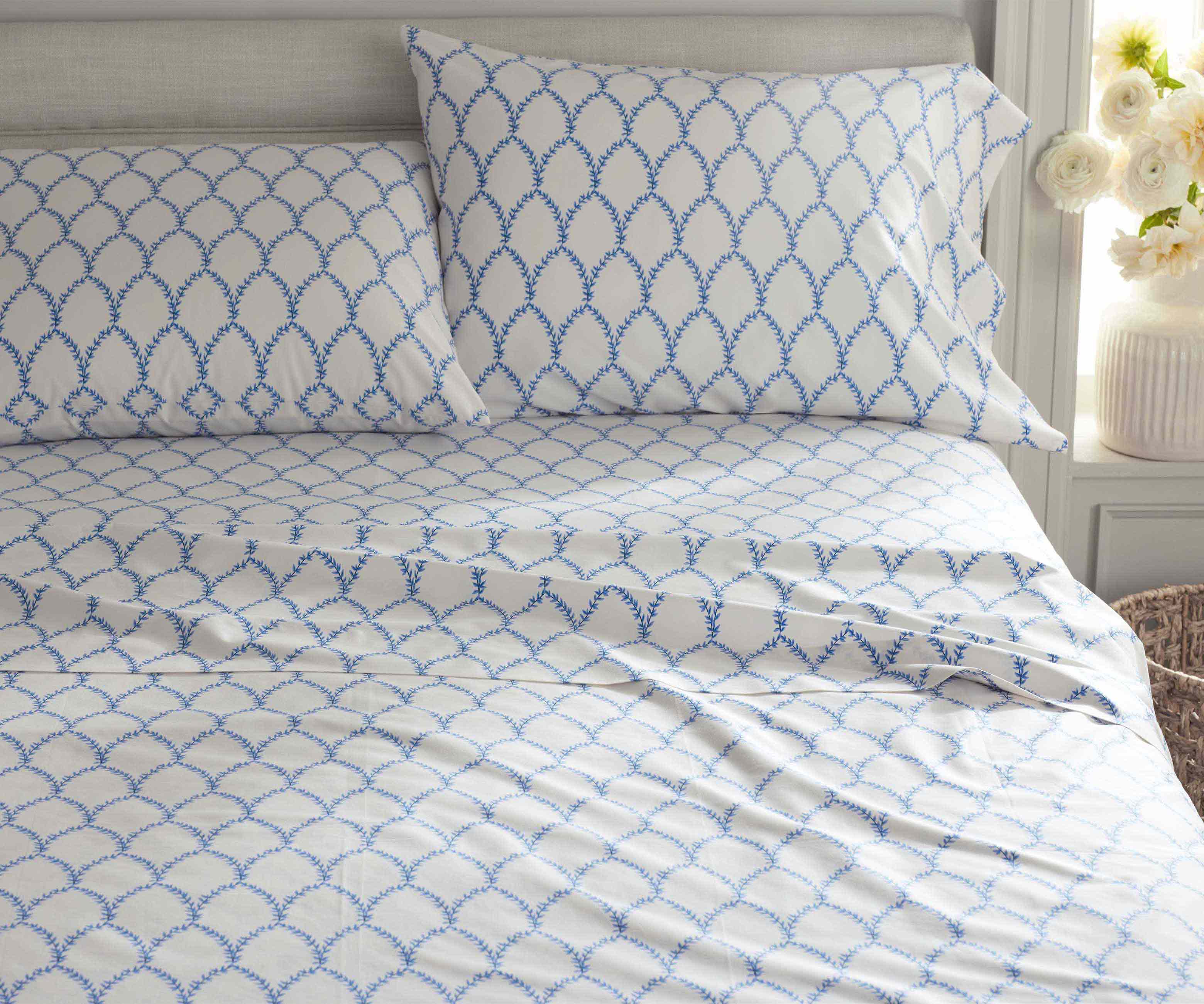 Filigree leaves create a crosshatch grid filled with botanicals on our Estee Garden bedding, a design that's both classic and feminine.